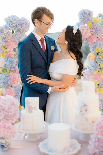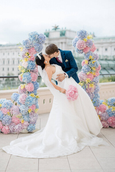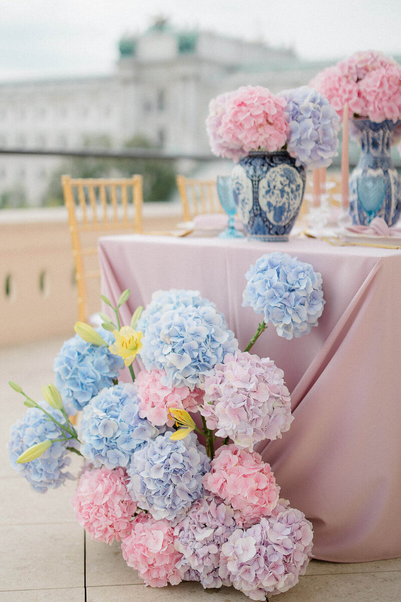 In the heart of Vienna, we brought a dreamy wedding vision to life at the iconic Albertina Museum. Inspired by Monet’s The Water Lily Pond, soft pink and blue hydrangeas set an impressionist tone, complemented by elegant details like custom “water lily” ring boxes and blue-and-white porcelain. Authentic Austrian touches, including live harp music and the traditional Dirndl, added charm. This shoot perfectly captured Vienna’s magic—an ideal inspiration for your destination wedding fairy tale!